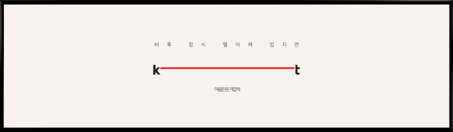 KT는 기존 로고와 달리 K자와 T자를 멀리 떨어뜨리고 상하단에 '비록 잠시 떨어져 있지만 마음만은 가깝게'라는 문구를 넣었습니다.