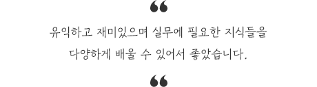 체계적이었고 꼼꼼하고 열정적인 선생님들 덕분에 포기하지 않고 개인적으로 만족할 만한 결과물을 만들어 낼 수 있었습니다. 구직활동에도 적극적으로 참여할 수 있을 만큼 자신감도 생기고 실무에서도 잘 적응해낼 수 있을 것 같다는 생각이 들어 길기도 하고 짧기도 했던 5개월이 참 알찼던 시간이었습니다.