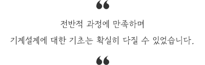 강의가 굉장히 고퀄리티여서 수업하면서 기계설계에서 얻어가는 정보가 굉장히 많았습니다. 무엇보다 서로 열심히 해서 꼭 취업에 성공하도록 분위기를 마련해주시고, 학원 외 시간에도 학생들이 공부할 수 있도록 일부러 강의장에 나오셔서 한 명, 한 명 다 봐주셨습니다.
