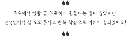 혼자서 준비하려니 뭔가 마음이 생기지 않아서 학원 등록하며 공부했는데 정말 선택 잘했다고 생각합니다. 강의해주신 선생님께서도 이해 잘되도록 핵심만 뽑아서 설명 잘해주셨어요. 덕분에 계속 미루던 자격증 알차게 공부하고 취득할 수 있을 것 같습니다.