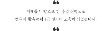 선생님께서 신경 써서 이해하기 쉽게 설명해주시고 차근차근 따라 할 수 있게 도와주십니다! 처음 컴활 공부를 하는데 낯설지 않게 공부할 수 있어서 좋았습니다!!