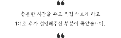 1분도 허투루 쓰지 않으시는 선생님 기간에 비해 학습량이 많았는데 설명을 잘해주시고 교재를 잘 활용하셔서 정말 수업을 잘하시는구나~ 생각했습니다. 감사합니다.